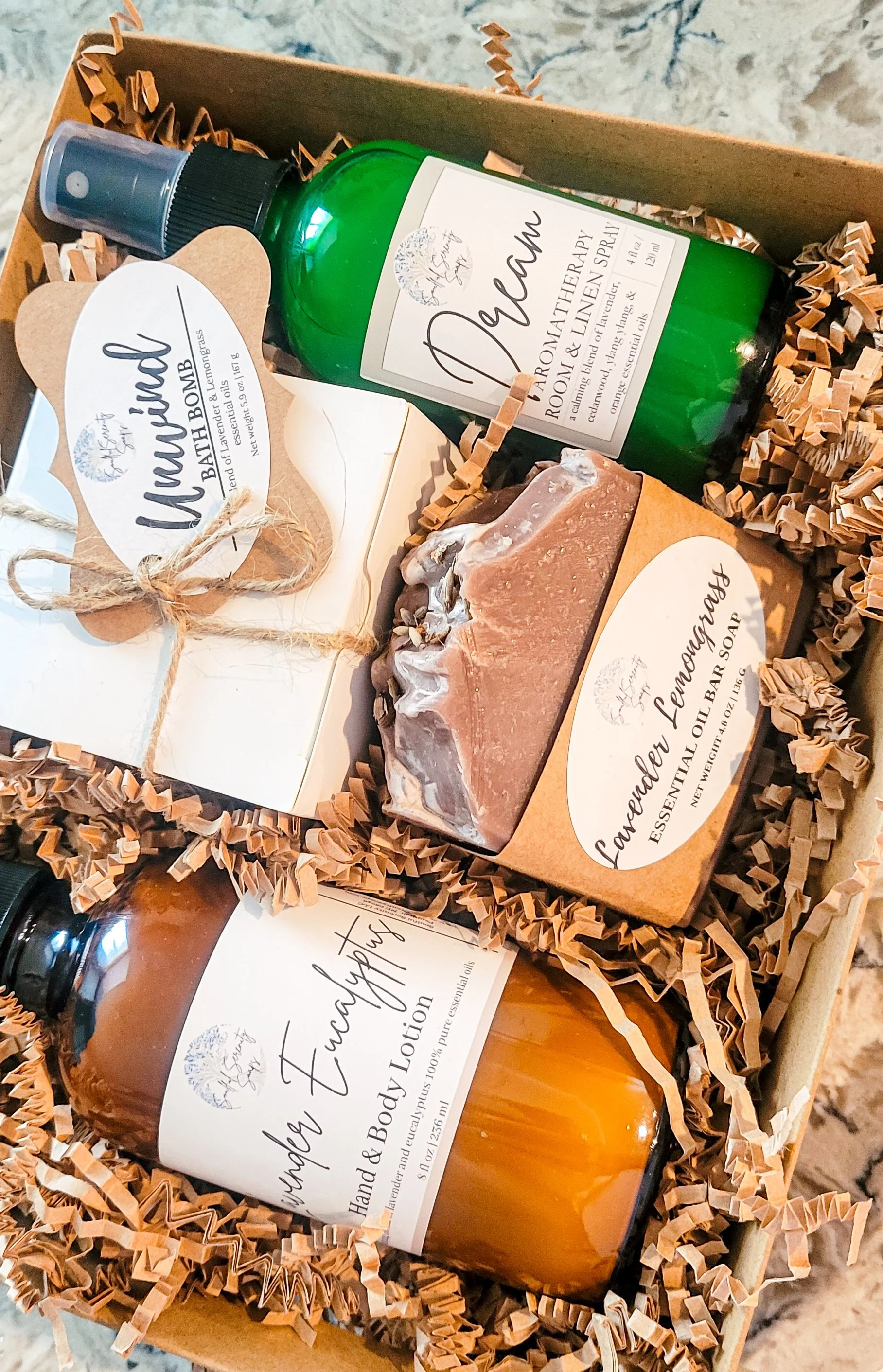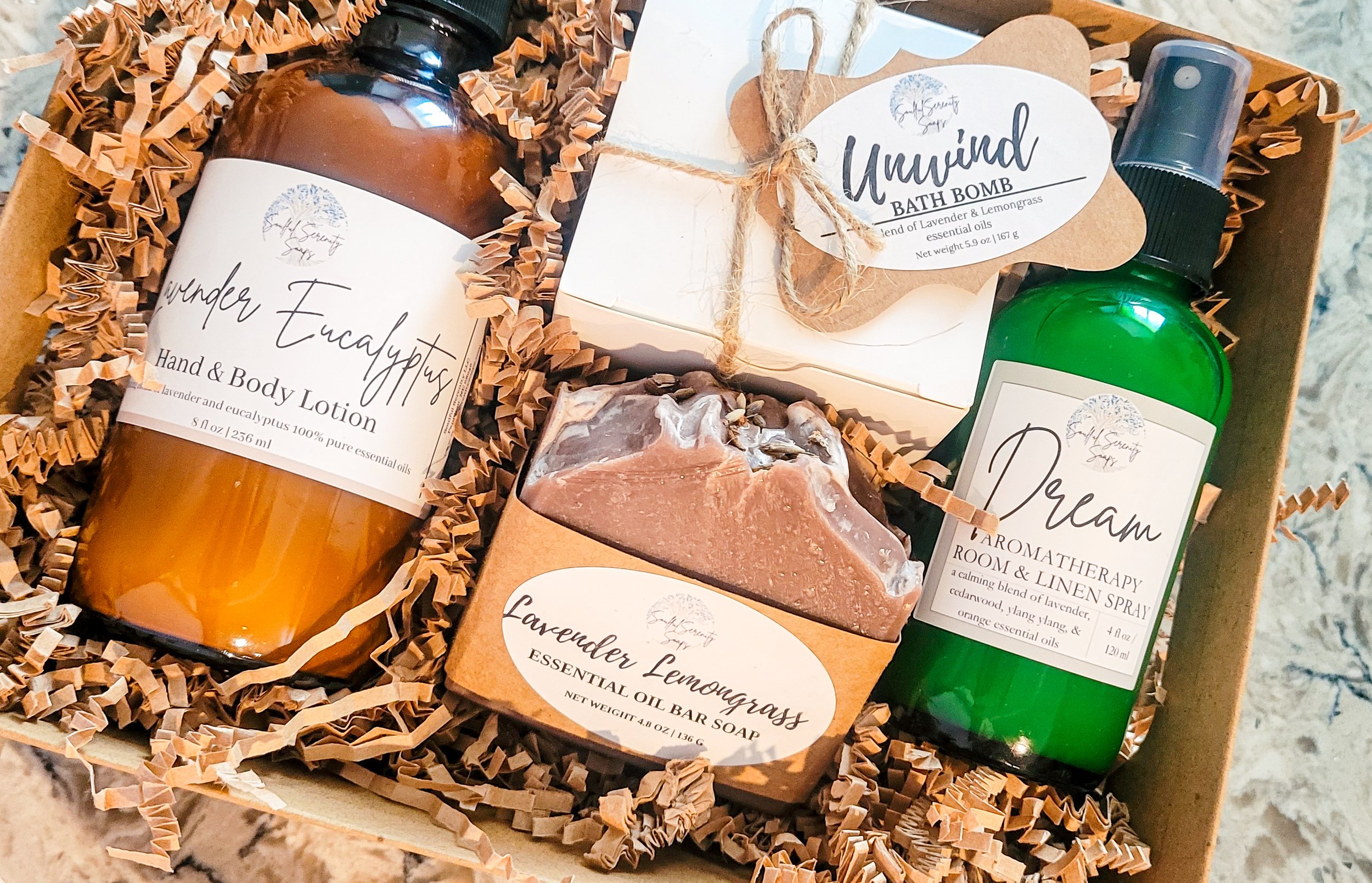 This lavender based set works to help you relax and rest well. Start off with a bath bomb and bar of lavender + lemongrass soap, hydrate your skin with lavender orange lotion, and then spritz your bed linens with our Dream spray to unwind and decompress. This set includes: